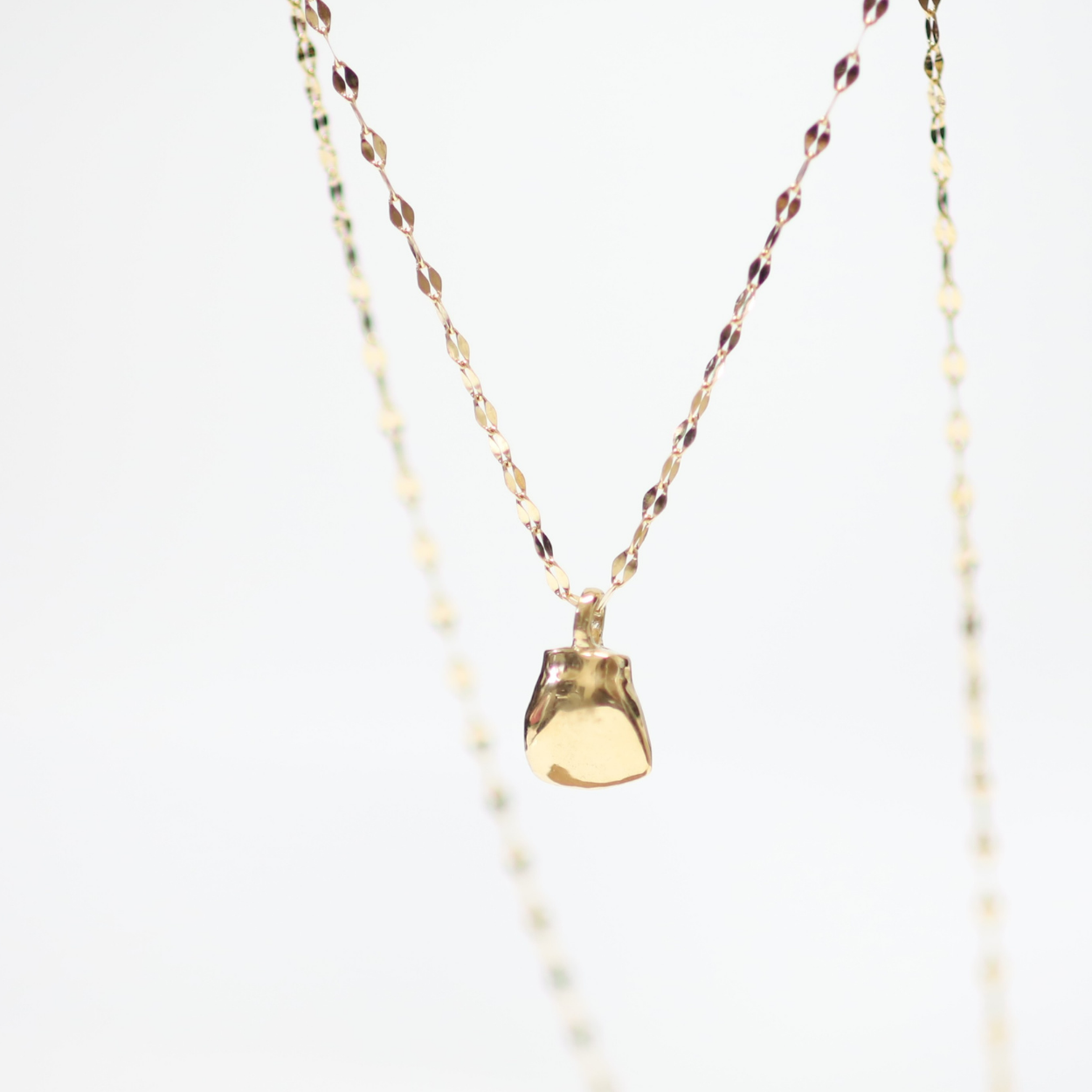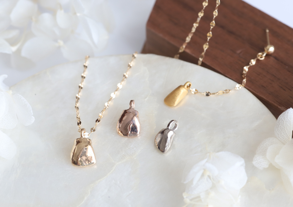 金乳歯のモチーフを最も引き立てる、洗練されたデザイン。花びらを連ねたような繊細なチェーンは、胸元に上品な輝きを添え、シンプルながらも存在感のある美しさを演出します。
